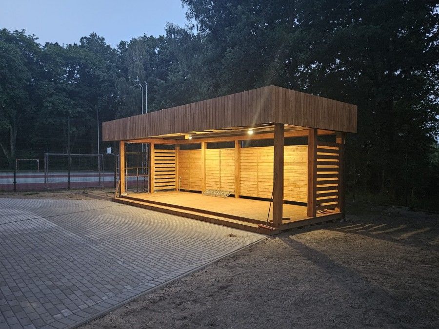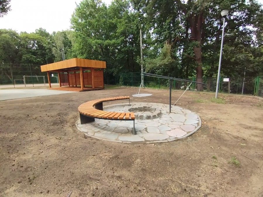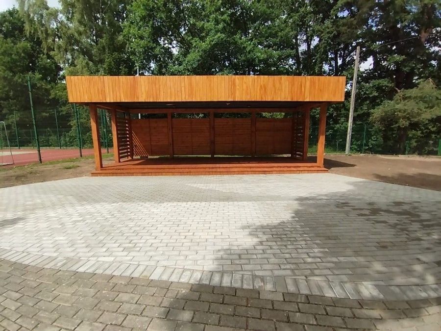 Koło szkoły została wybudowana wiata sceniczna o konstrukcji drewnianej o pow. 35 m2, zostały zamontowane ławki pomiędzy zadrzewieniem, a także wykonane miejsce na ognisko z rusztem grillowym. Wiata została oświetlona, a plac przed obiektem został wyłożony kostką polbrukową. Ponadto wiata została wyposażona w mobilną platformę najazdową, antypoślizgową, o odpowiedniej nośności, umożliwiającą dostęp na podest drewniany wiaty osobom ze szczególnymi potrzebami, w tym na wózku inwalidzkim. Ciekawie została też zagospodarowana ścieżka edukacyjna o długości ok. 2 km na odcinku od pergoli w kierunku parkingu na granicy z Gminą Czarna Dąbrówka: została ona wyprofilowana na odcinkach o łącznej długości ok. 130 m i oznakowana, zamontowane zostały tablice informacyjne, ławki, barierka drewniana oraz barierki o długości 100 m w formie liny rozwieszonej na drewnianych palikach na stromym odcinku trasy.