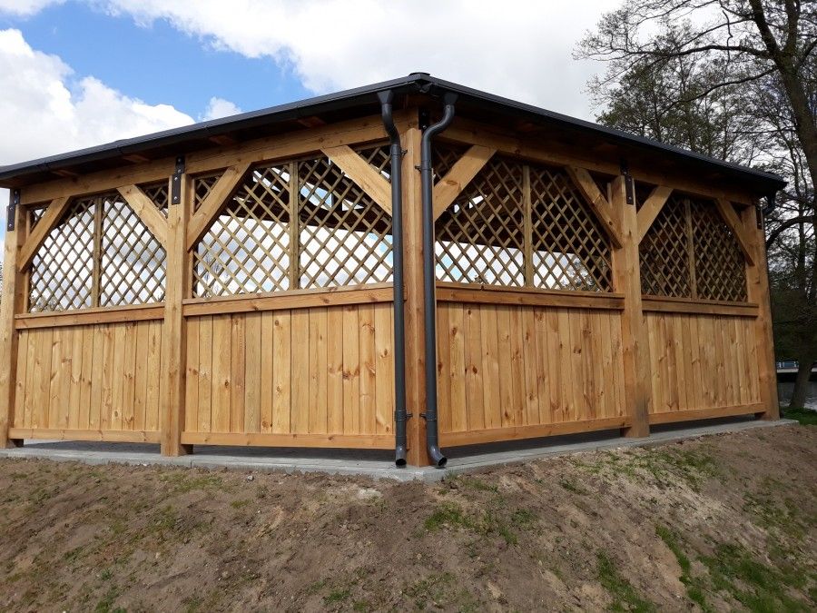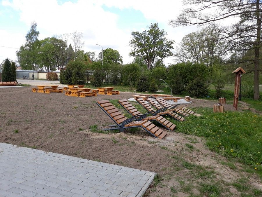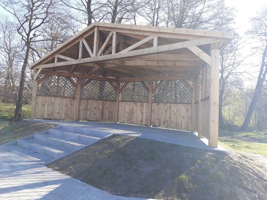 Zakres zadania objął zagospodarowanie działek obiektami i urządzeniami tj.: budowa sceny letniej z altaną o konstrukcji drewnianej, budowa murowanego grilla, utworzenie miejsca na ognisko, ławostoły – 4 szt., urządzenia do siłowni zewnętrznej, leżaki parkowe – 5 szt., stojak na rowery, ławki parkowe – 4 szt., ławki ogniskowe – 5 szt. i kosze na śmieci – 4 szt. Utwardzono też część placu. Ponadto wykonano 2 tablice informacyjne i 3 strzałki kierunkowe dot. ścieżki edukacyjnej „MEGALITY”  na terenie projektowanego terenu i w okolicy megalitów przy rzece Łupawa.