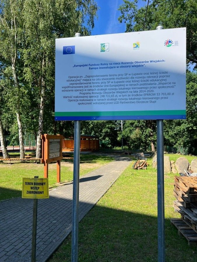 Operacja pn.: „Zagospodarowanie terenu przy SP w Łupawie i leśnej ścieżki edukacyjnej” mająca na celu Stworzenie możliwości dla rozwoju rekreacji poprzez zagospodarowanie terenu przy SP w Łupawie i leśnej ścieżki edukacyjnej w terminie do dnia złożenia wniosku o płatność ostateczną współfinansowana jest ze środków Unii Europejskiej w ramach działania „Wsparcie dla rozwoju lokalnego w ramach inicjatywy LEADER” poddziałanie „Wsparcie na wdrażanie operacji w ramach strategii rozwoju lokalnego kierowanego przez społeczność” objętego Programem Rozwoju Obszarów Wiejskich na lata 2014-2020